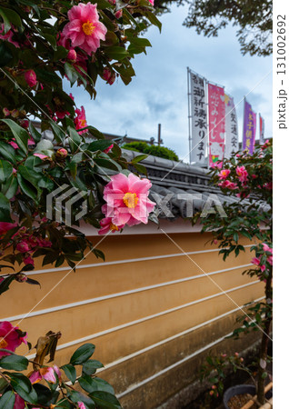 中山寺山門前のサザンカ開花、3月11日、宝塚市、日本
