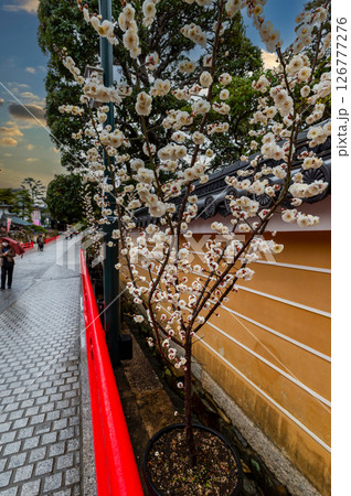 朱色の欄干と春を告げる満開の白梅、3月11日、日本