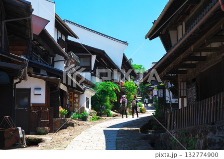 初夏の宿場町 馬籠を散策する観光客