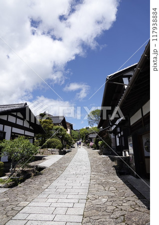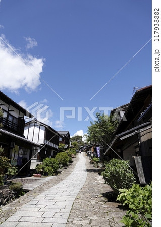 馬籠宿の古い町並みと急峻な坂の石畳 青空