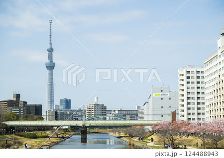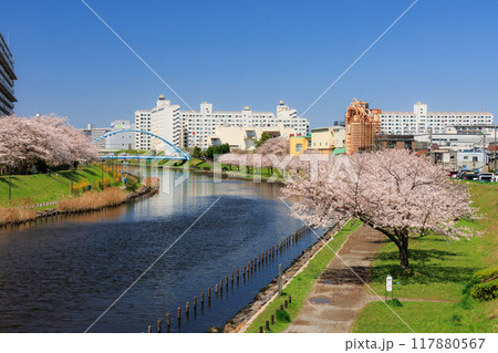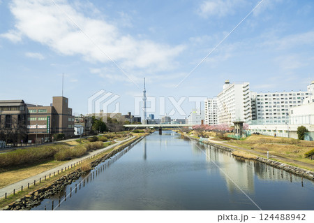 東京葛飾奥戸に流れる春の中川とスカイツリーの見える町