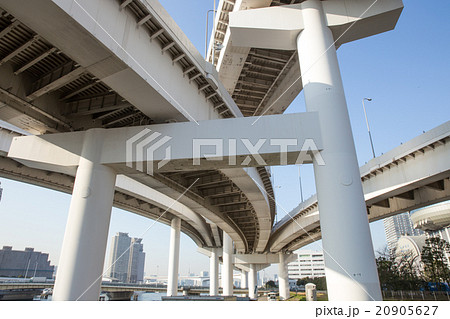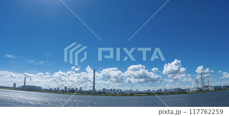 江東区南砂町と江戸川区西葛西にまたがる荒川河川敷首都高速湾岸線 夏の青空と入道雲