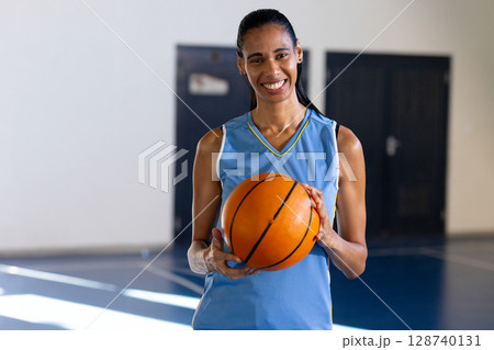 Woman standing on indoor court wearing light blue jersey, holding orange basketball and smiling