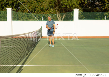 Senior male standing behind tennis net on court, holding racket and featuring green mesh fence