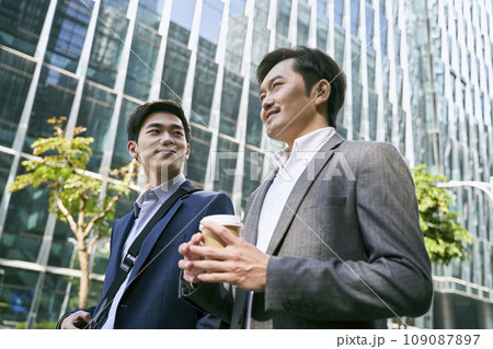 two asian businessmen walking talking on street