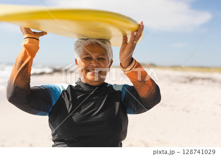 Senior woman holding yellow surfboard overhead on sandy shoreline, wearing black orange wetsuit