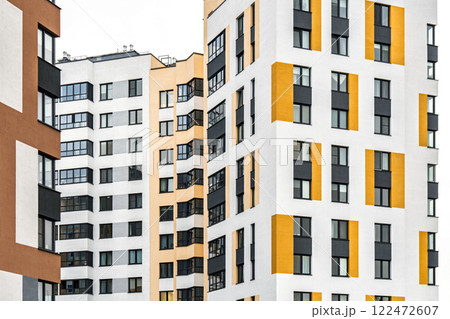 Modern apartment building facade, featuring beige, yellow, white and brown tones with dark-framed windows with colorful accents. Urban housing concept