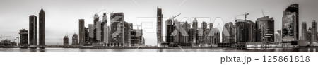 Monochrome city skyline with tall skyscrapers reflecting on calm water under a cloudy sky, Dubai Marina bay UAE