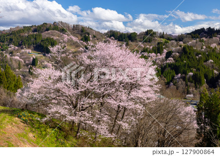 長野県長野市中条住良木 中条地区の斜面に咲く大きな桜