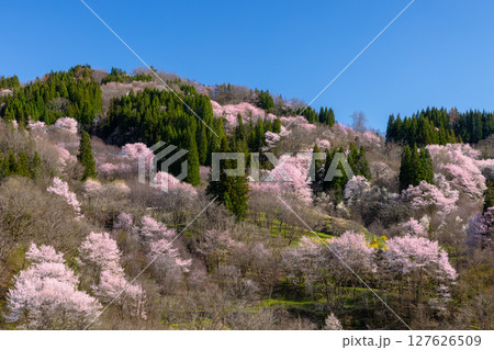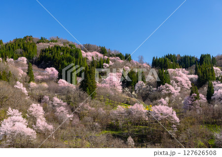 長野県長野市中条住良木 斜面一面にヤマザクラやオオヤマザクラなどの桜が咲く中条の桜