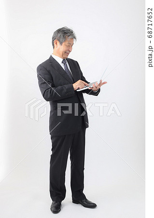 ノートパソコン持った全身スーツ姿 企業主 社長 重役 売上などパソコンチェック