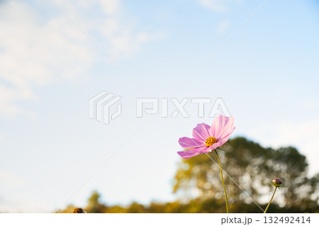 秋の澄んだ空と可憐な秋桜のロマンチックな情景