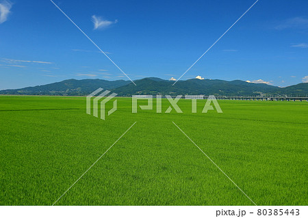 岩手県一関市 水田の風景と東北新幹線高架橋