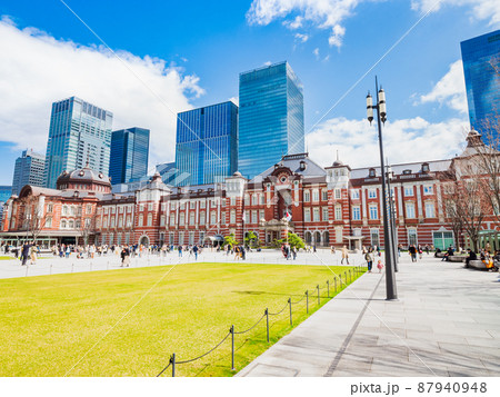 日本の東京都市景観 東京駅の赤レンガ駅舎や帰宅するビジネスマンやOLら。コロナ禍は今も…=4月12日