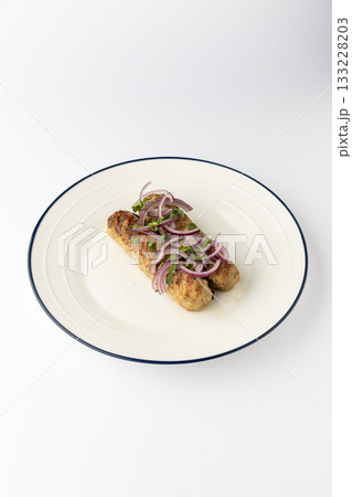 Grilled kofta kebabs with red onion and herbs on plate, isolated on white
