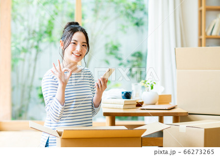 スマホを操作して引越し業者を検索する若い女性