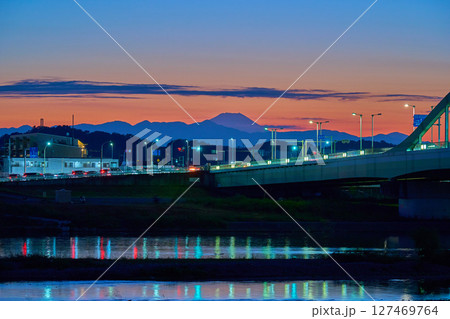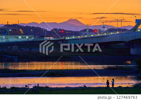 日没後の東京都狛江市の多摩川河川敷から西側の眺望(多摩川,多摩水道橋交差点,富士山,ブルーアワー)