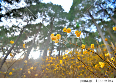 関東地方・蓑毛のミツマタ・丹沢の登山道を三ツ股の群生を眺めて歩くイメージ・神奈川県秦野市蓑毛(10)
