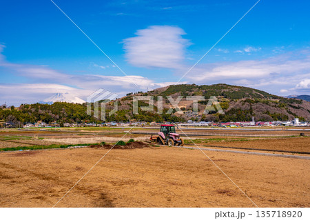 (静岡県)丹那盆地で農作業するトラクタと富士山