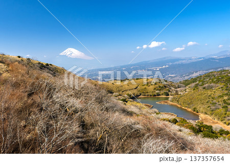 伊豆スカイライン・玄岳駐車場から氷ヶ池と富士山・冬の風景