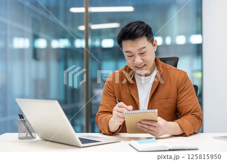 An asian businessman sits at his desk, making notes in a notebook while working on a laptop in a modern office setting.