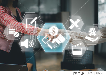 Cheerful meeting room, businesspeople celebrate with handshaking. Successful project was completed before the deadline. Business partnership and collaboration in project management. Habiliment