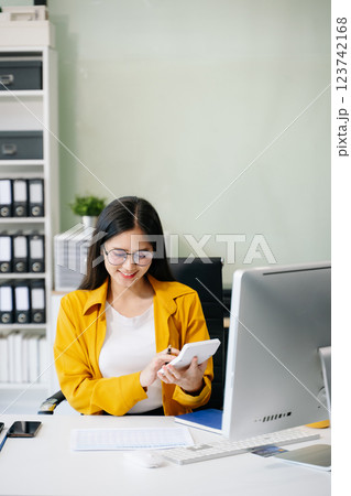 Young Asian businesswoman working with working notepad, tablet and laptop documents talking