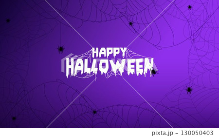 Happy Halloween greeting card with spooky spider webs and black spiders on a purple background, perfect for Halloween celebration, party invitations, and festive decorations. vector design.