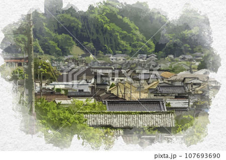 水彩画風 三日月の街並み 兵庫県佐用郡佐用町