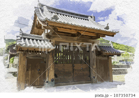 水彩画風 三日月 三日月藩乃井野陣屋跡 通用御門 兵庫県佐用郡佐用町