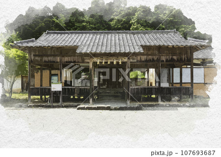 水彩画風 三日月 日岡八幡神社 拝殿 兵庫県佐用郡佐用町