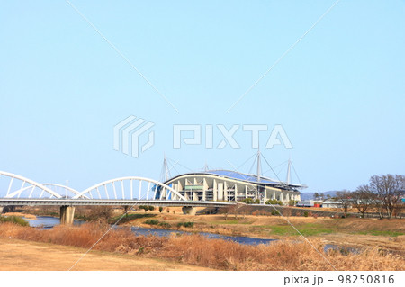 愛知県豊田市、矢作川と豊田スタジアムの風景