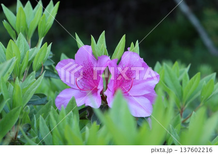 新緑をバックに双子のように咲く久留米ツツジのボカシ撮り