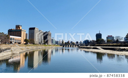 青空の街並みが映る乙川の水鏡〈明代橋より桜城橋を臨む/愛知県岡崎市〉