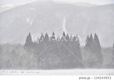 冬の北海道乙部町で吹雪の林の風景を撮影