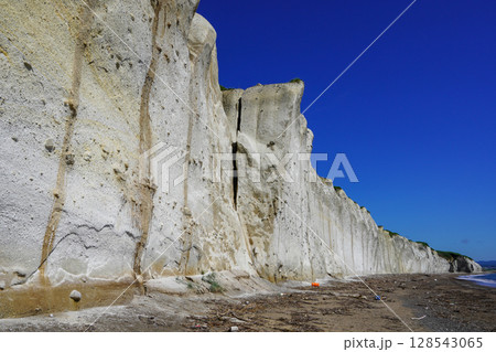 青空を背景に白亜の壁が連なる北海道乙部町滝瀬海岸シラフラ Ver1