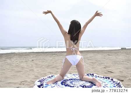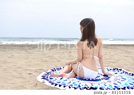 九十九里の海岸でくつろぐビキニ姿の若い女性