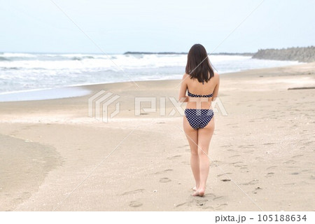 九十九里の海岸を散歩するビキニ姿の若い女性