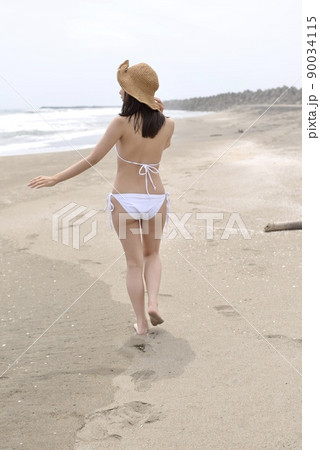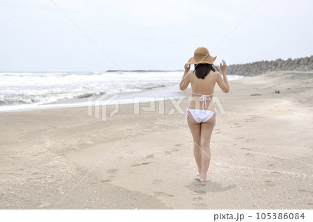 九十九里の海岸を散歩する白いビキニ姿の若い女性