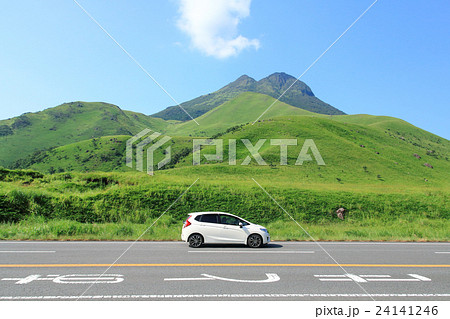 大分県 くじゅう連山とやまなみハイウェイのドライブイメージ(白のエコカー 前)