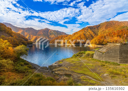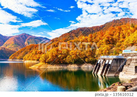 秋の福井県の九頭竜ダム 紅葉に色づく湖