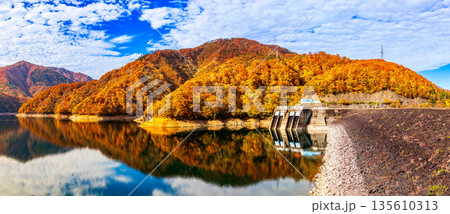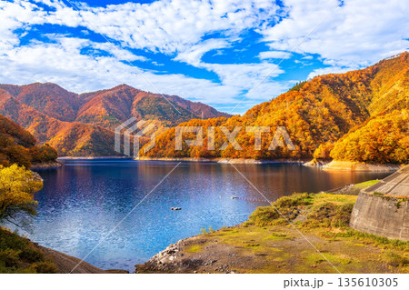 秋の福井の九頭竜ダム 紅葉に色づく湖