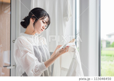 洗濯物の仕上がりに悩む主婦の女性(生乾き・部屋干し・臭い・)