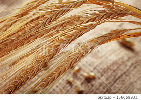 Wheat stalks placed on a light background show the harvest and cultivation process