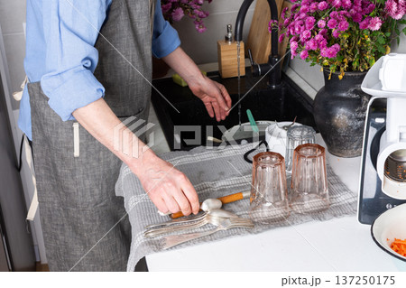 A man stands at a sink in a kitchen, washing dirty dishes and glassware. Flowers sit on the counter as fresh light comes in through the window. The setting is busy and practical, banner