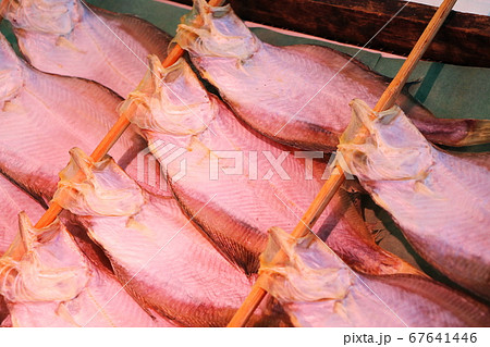 dried fish arranged neatly at market in coastal region during morning hours. closeup.