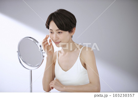 美容 鏡を見る女性 悩む