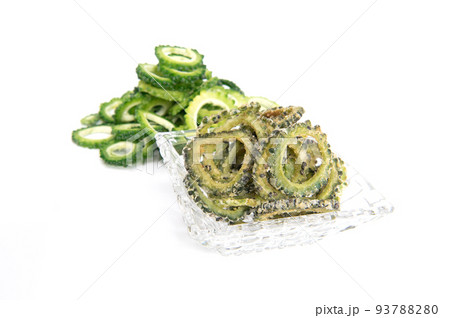 Homemade bitter gourd chips in glass bowl isolated on white background.