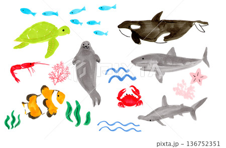 夏の海のカラフルな生き物イラスト