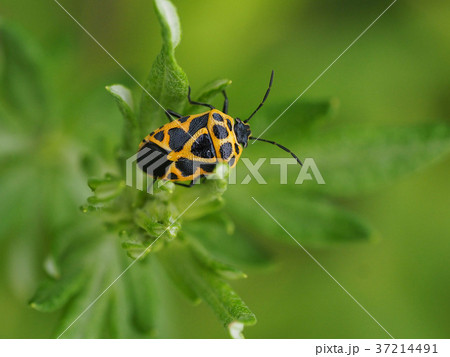 生き物 昆虫 ヒメジュウジナガカメムシ、赤と黒のまだら模様。大きさは八ミリ前後です